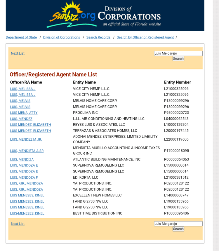 The purported owner, Luis Melgerejo, is a ghost on background checks. We get one guy in MA. He was interviewed HERE ,why the secrecy? Why is there no business in Florida registered under that name?